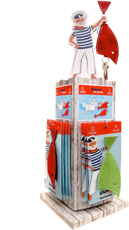 Našim klijentima nudimo najbolji način prezentacije ovog proizvoda: privjesci Glavoč dolaze s drvenim stolnim držačem. Na vrhu je ribar FILO s privjeskom u ruci tako da kupci mogu i sami “progutati” ključeve.